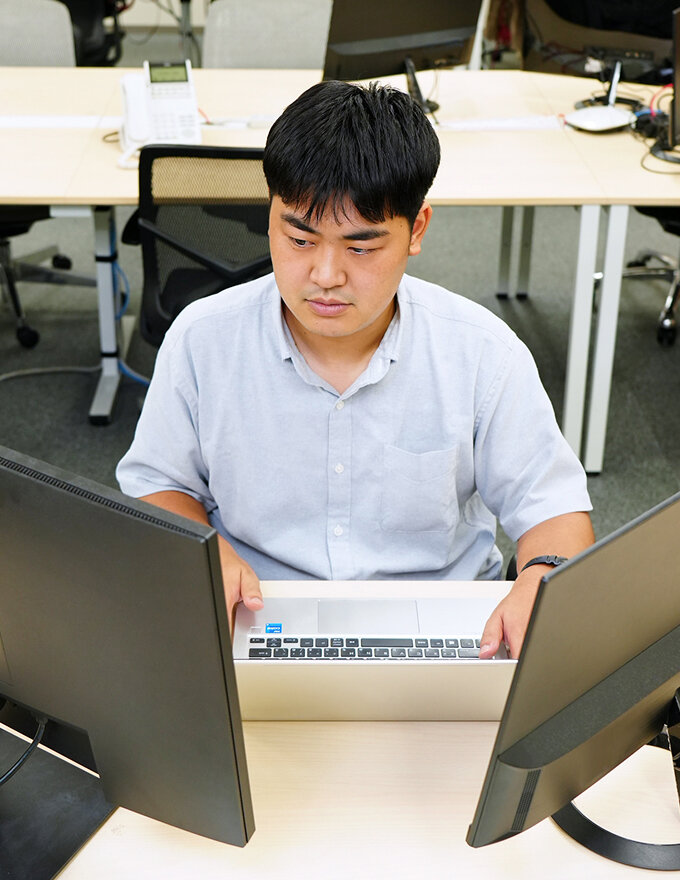 - 現在は保守運用を担当していて、お客様からの依頼に応じた修正対応やユーザー管理を行っています。入社してすぐは動作確認のための単体テストをしていましたが、その後はバックエンドの開発業務にも携わるようになりました。表に見える部分よりも、裏側で動く仕組みをつくっていくのは、とても面白くやりがいがあります。